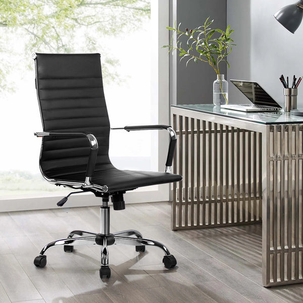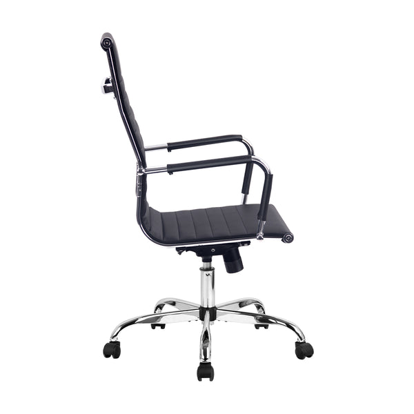Bring a touch of contemporary living to your home or office interior with our Artiss office chair. Full of iconic styling, the office chair is absolutely sleek and elegant in every profile. More so with its faux leather upholstery that offers sophistication and class. Better still, the seat is rotatable 360 degrees to face any direction with ease. It also comes with both height and tilt adjustment to allow you to be seated at your most comfortable position and posture.Thoughtful touches such as a chrome-finished rack at the back of the chair allows for hanging of ties, scarfs and other fashion accessories. Not least, the similar chrome adorned base has five wheel castors for easy movement.