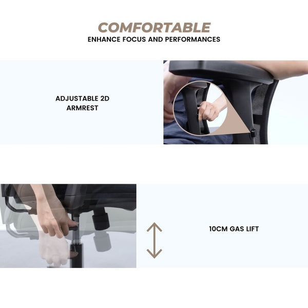 Not only does it come with a 2D armrest with a PU surface, the chrome gas lift allows for easy adjustment of user's height sitting preference and the chair's multi functional mechanism offers 3 different kinds of position locking that allows user to sit comfortably at different angles for a long duration of time.