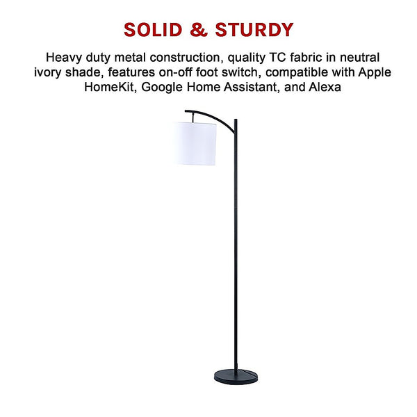 A new twist on an old favourite, this lamp channels the look of 20th-century streetlights, hanging from an arch. The neutral ivory of the shade glows against the black lampstand for an instant wow factor for any room in your home. Its warm light creates a sense of instant relaxation for family and guests alike. Its LED bulb provides an average of 20 years of service, saving you on energy costs every minute you have it on.