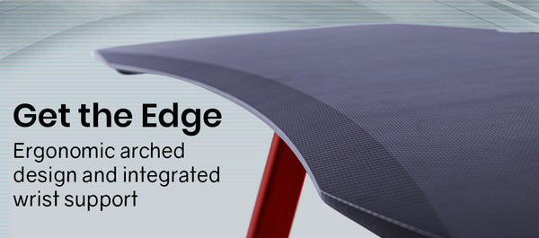 The desktop features an arched design that is tapered on an angle for optimal comfort during marathon sessions.